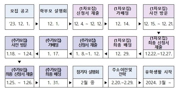 2024학년도 1학기 농촌유학을 희망하는 학생(학부모)는 12월 11일 12시까지 재학중인 학교로 신청서를 제출하면 된다. 12월 14일 전남/전북/강원 교육청 홈페이지에서 가배정 결과를 확인하여, 사전 방문(12.15. ~ 12. 21.) 후 최종 신청서 제출(12.22.~12.26.) 절차를 거쳐 12월 29일 대상자가 최종 확정된다.