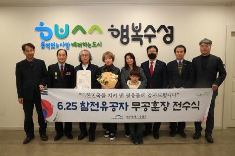 대구 수성구는 지난 30일 6·25전쟁에 참전해 공을 세운 故 복기선 상병 유가족에게 화랑무공훈장과 증서를 전수했다.