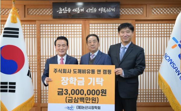 같은 날 주식회사 도깨비 유통 앤 캠핑사의 박영걸 대표도 장학금 기탁을 위해 논산시청을 찾았다. 박 대표는 강경젓갈축제의 부대 행사였던 만물도깨비 경매 수익금에 회사 내 자체 모금액을 얹어 총 3백만 원을 기부했다. 박 대표는 “상대적으로 어려움을 겪는 학생들이 학업에 매진할 수 있도록 경제적 부담을 줄여주는 버팀목이 되고 싶다”며 기탁의 뜻을 밝혔다.