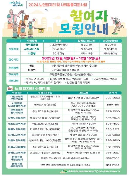 은평구가 오는 4일부터 15일까지 ‘2024년 노인일자리 및 사회활동지원사업’ 참여자 5,467명을 모집한다고 밝혔다.