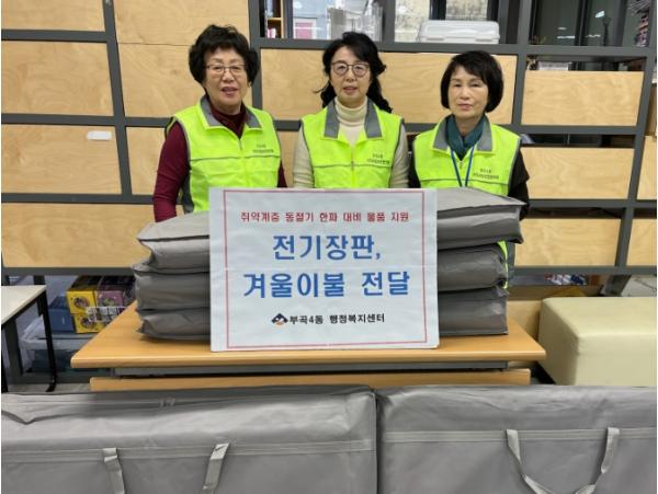 부산 금정구 부곡4동은 저소득 주민 27가구에 보온용품(전기장판 22개, 겨울이불 5채)을 지원하는 ‘온溫마을 따뜻하게’ 사업을 추진했다.