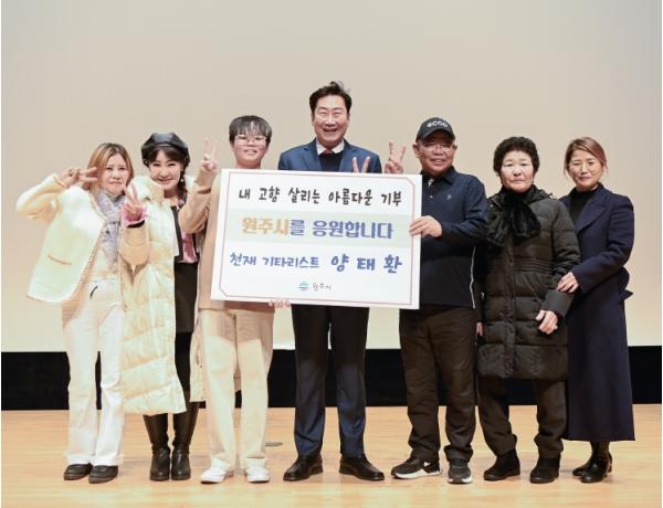 원강수 원주시장은 “기타리스트 양태환군에게 깊은 감사를 드리고, 앞으로도 원주시와 아름다운 인연이 지속되기를 바란다.”며, “기탁해주신 기부금은 살기 좋은 원주를 만들기 위해 시민들에게 꼭 필요한 곳에 사용하겠다.”고 전했다.
