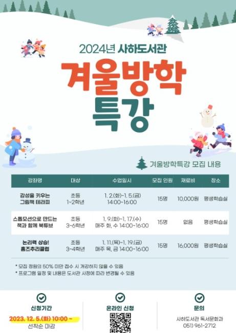 부산광역시립사하도서관은 내년 1월 2일부터 19일까지 초등학생을 45명을 대상으로 겨울방학 특강 프로그램을 운영한다.