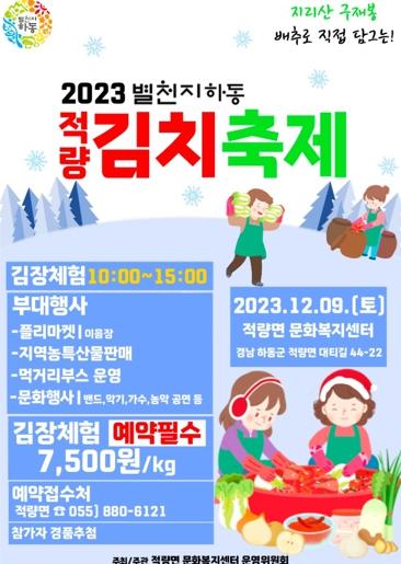 청정 지리산 구재봉 자락에서 재배된 신선한 배추와 고추 등의 양념으로 김장 체험하고 가져가는 2023 별천지 하동 적량 김치축제가 오는 9일 적량면문화복지센터에서 열린다.