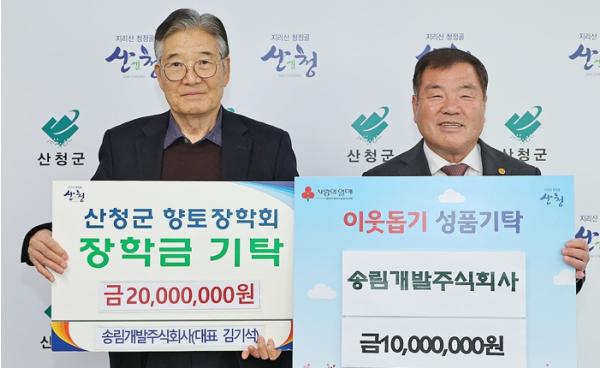 산청군은 창원시에 위치하고 있는 ㈜송림개발이 이웃돕기 성금(1000만원)과 향토장학금(2000만원) 등 총 3000만원을 기탁했다고 4일 밝혔다.