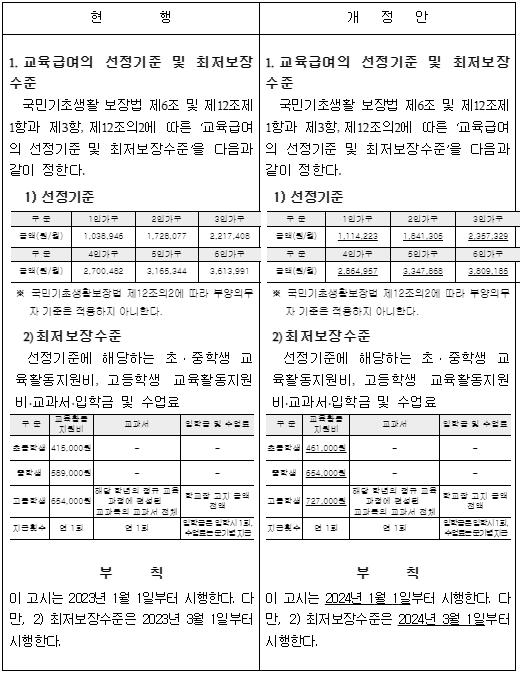 교육부는 12월 4일부터 '2024년 교육급여의 선정기준 및 최저보장수준' 일부개정안에 대한 행정예고를 실시한다.