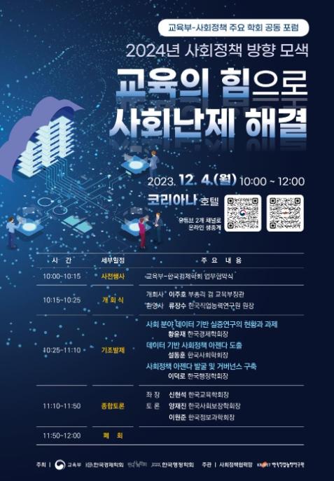 교육부는 12월 4일, 코리아나 호텔에서 ‘2024년 사회정책 방향 모색 : 교육의 힘으로 사회난제 해결’을 주제로 사회정책 분야의 6개 주요 학회와 함께 공개토론회를 개최한다.