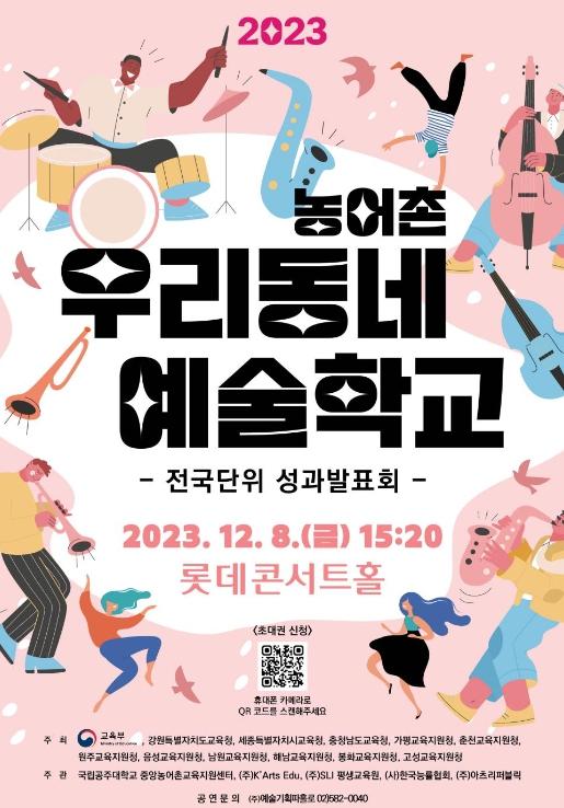 교육부는 12월 8일 롯데콘서트홀(서울 잠실)에서 개최되는 2023 ‘우리동네 예술학교’ 전국단위 성과발표회에서 농어촌 참 좋은 학교 공모전에 최종 선정된 14개 학교와 교원에 대한 시상(교육부장관상)을 진행한다.