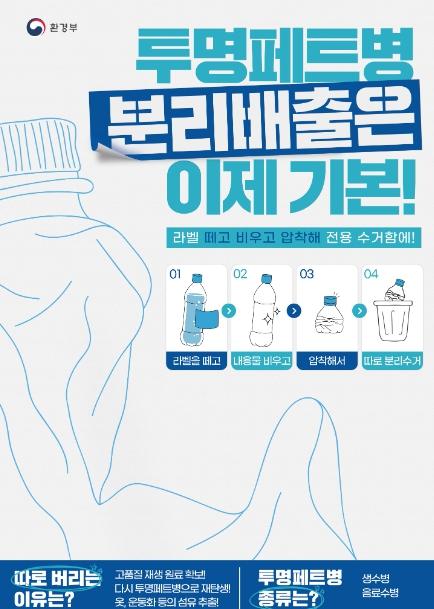 투명 페트병 별도 배출제는 투명한 페트병의 내용물을 비우고 포장 비닐을 제거한 후 압착해 뚜껑을 닫고 전용 수거함에 배출하는 것이다. 재활용품의 부가가치를 높여 기존 원료를 대체하는 재생 원료로 활용된다.