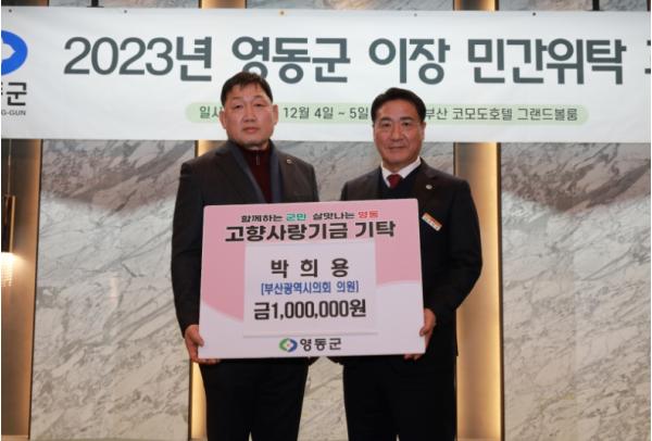 충북 영동군은 박희용 부산시의회 의원이 고향사랑기부금 100만원을 기탁했다고 밝혔다.