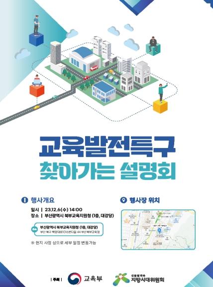 부산시는 6일 오후 2시 부산북부교육지원청 대강당에서 교육부 주관 '교육발전특구 찾아가는 설명회'가 열린다고 밝혔다.
