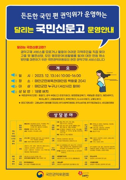 군은 오는 12월 13일 태안군민체육관(태안읍 백화로 204)에서 주민들의 각종 고충사항에 대한 상담을 실시하는 ‘달리는 국민신문고’를 운영한다며 군민들의 많은 관심과 참여를 당부했다.