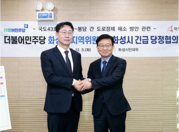 권칠승 더불어민주당 화성병 지역위원장과 정명근 화성시장을 비롯한 도의원, 시의원, 관계 공무원은 5일 봉담에 위치한 화성시민대학에서 국도 43호선(봉담~팔탄) 도로의 교통체증 해소 방안을 강구하기 위한 당정협의회를 실시했다.