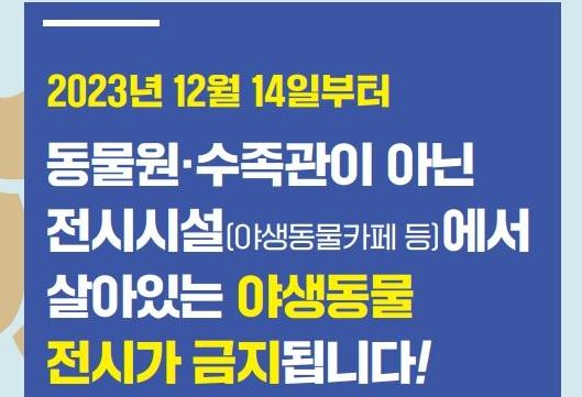 살아있는 야생동물의 전시는'야생생물법'개정에 따라 앞으로 허가 및 등록된 동물원 또는 수족관, 공익적 목적을 위해 법률로 규정한 야생동물 관련 시설에서만 가능하다.