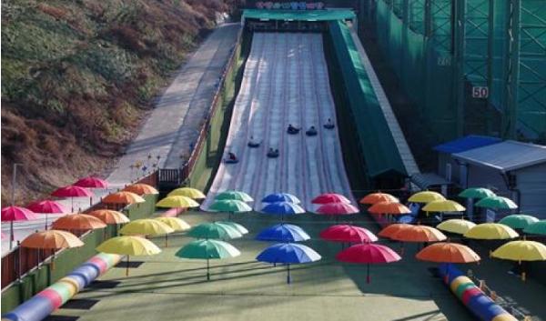 78m 길이의 슬로프에 6개의 레인으로 구성된 썰매장은 13도의 아찔한 경사면을 타고 미끄러지듯 바람을 가르며 내려올 수 있게 돼 있다.