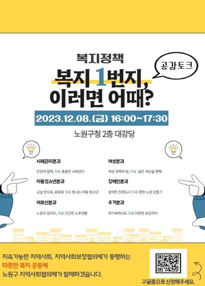 구는 지역사회보장협의체가 한 해 동안 추진한 사업 결과를 공유하는 노원구 지역사회보장협의체 정책제안회 '복지 1번지, 이러면 어때? 공감토크'를 개최하기로 했다. 지역 복지문제 해결을 위해 현장에서 애쓰고 있는 실무진과 ‘지속 가능한 지역사회’에 관심이 많은 구민이 한자리에 모여 논의하기 위해서다.