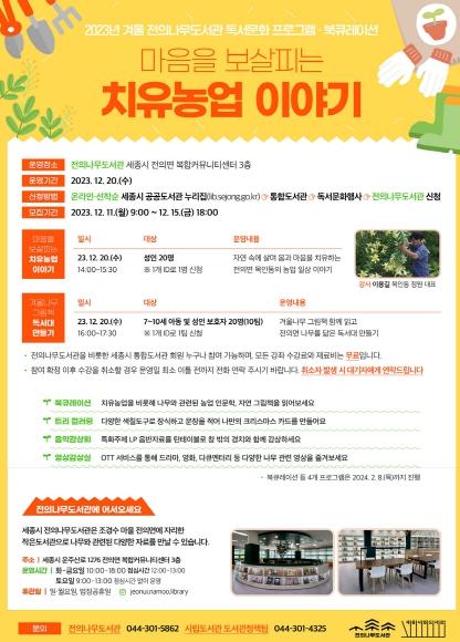 세종시립도서관이 ‘2023년 전의나무도서관 겨울 독서문화 프로그램’에 참여할 수강생을 오는 11일부터 온라인으로 선착순 모집한다.