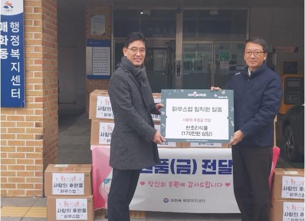 매화동 행정복지센터에는 지난 6일 ‘하우스업’ 임직원이 십시일반 모은 후원금으로 소외계층을 위해 마련한 반조리 식품 525개(170만 원 상당)를 전달했다.