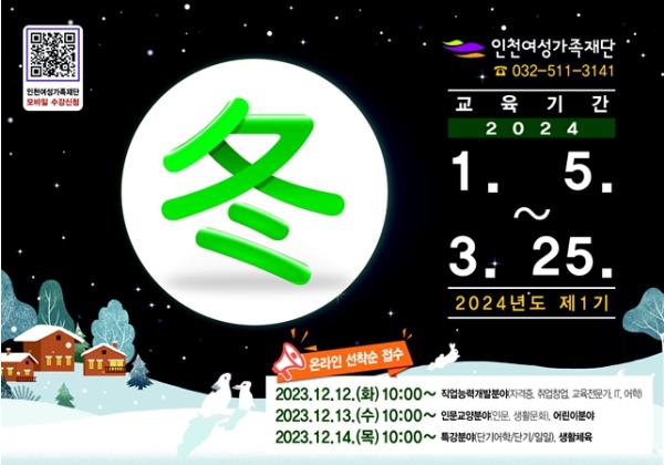 ○인천여성가족재단(대표이사 김미애)은 12월 12일부터 2024년도 1기 평생교육프로그램 수강생을 모집한다. [교육기간: 2024. 1. 5.(금) ~ 3. 25.(월)]