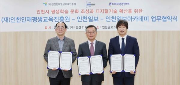 이날에는 류권홍 인천인재평생교육진흥원장, 박현수 인천일보 대표이사, 조성호 인천일보아카데미 대표이사 등 관계자들이 모여 ▲각 기관에서 추진하는 교육사업 홍보 협력 및 지원 ▲평생교육과 디지털기술 확산 위한 인적?물적 인프라 공유 등의 협력 방안을 약속했다.