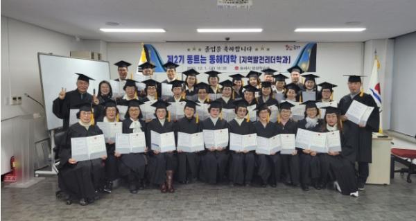 동해시는 제2기 동트는 동해대학 졸업식을 최근 평생 학습관에서 졸업생 38명이 참여한 가운데 개최했다고 밝혔다.