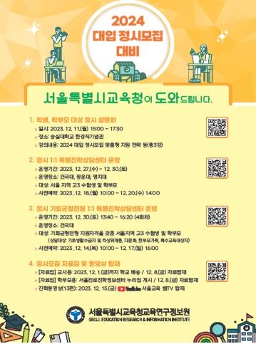 서울특별시교육청산하 교육연구정보원 은 2024 대입 정시모집을 효과적으로 대비할 수 있도록 ‘학생?학부모 대상 대입 설명회’ 및 ‘1:1 특별진학상담센터’를 운영한다.