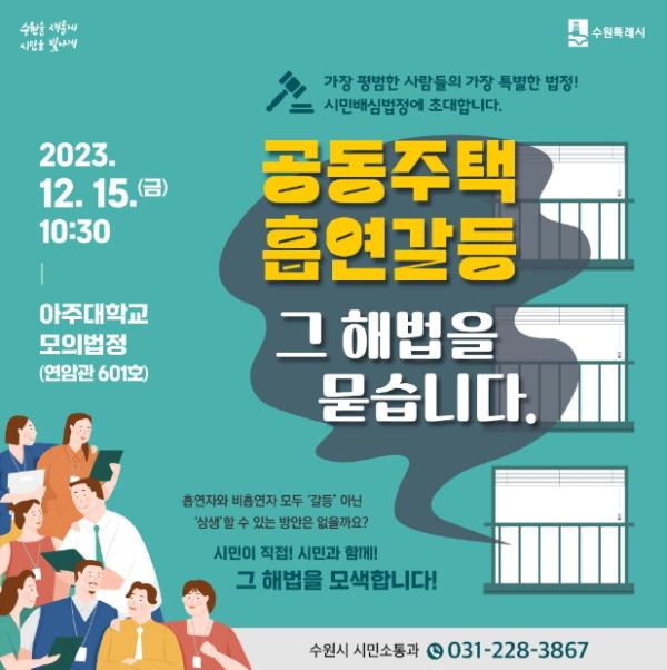 이번 시민배심법정은 수원시아파트입주자대표협회 회장 등 30여 명이 공동주택 흡연으로 인한 입주민 간 갈등을 합리적으로 해결할 방안을 찾기 위해 ‘공동주택 흡연갈등 해법 모색’ 안건을 시민배심법정에 신청하면서 열리게 됐다.