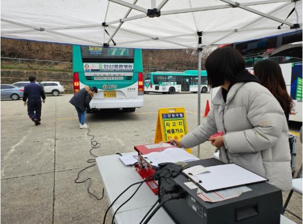 안산시 단원구는 지난 6일 겨울철 미세먼지 저감을 위해 선부동에 위치한 경원여객 차고지에서 운행차 배출가스 점검을 실시했다고 8일 밝혔다.