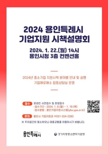 용인특례시는 금융?수출?연구개발 등 다양한 기업지원 정책 정보를 소개하는 ‘2024년 중소기업 지원시책 합동 설명회’를 22일 시청 컨벤션홀에서 연다고 12일 밝혔다.