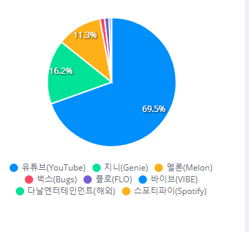 - 유튜브가 온라인 음악매체중 69.55% 점유