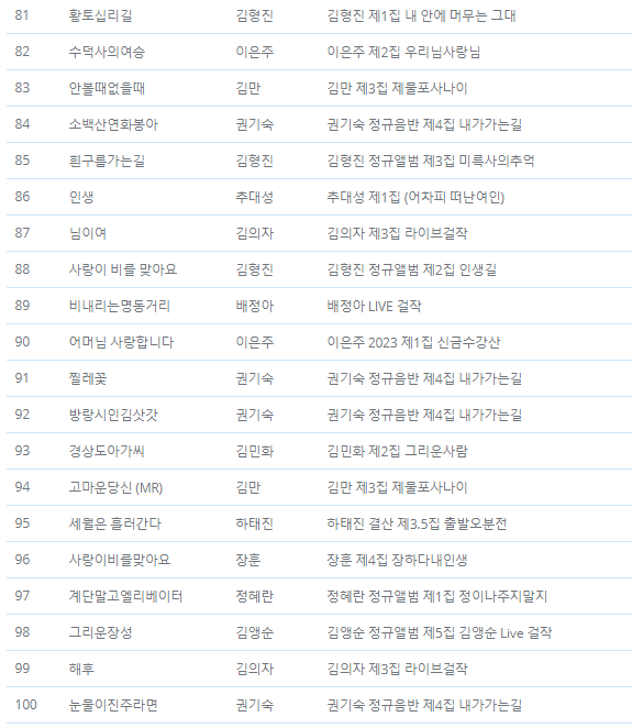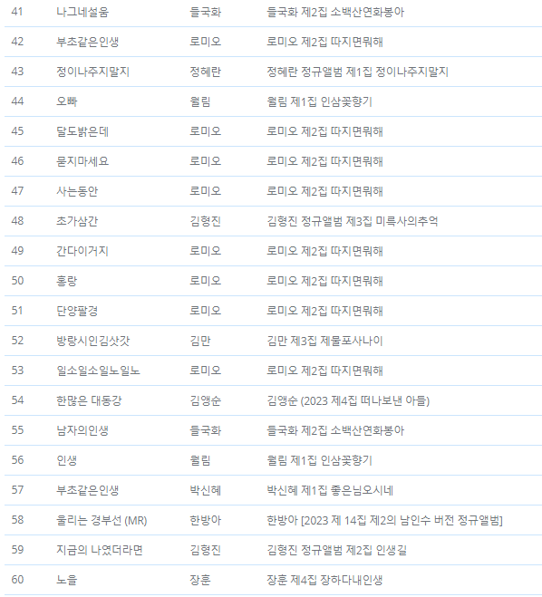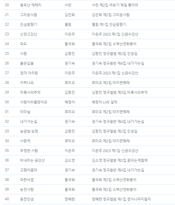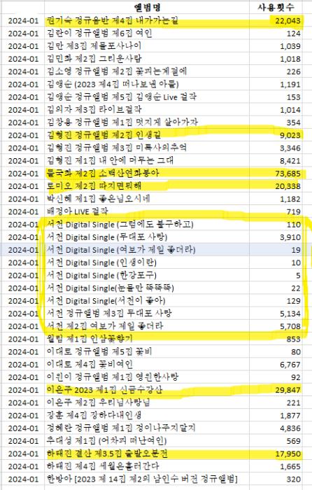 MT음반발매 2024.1월발표, 2023.11월 매체별 전송 점유율 및 앨범별 곡별 점유율