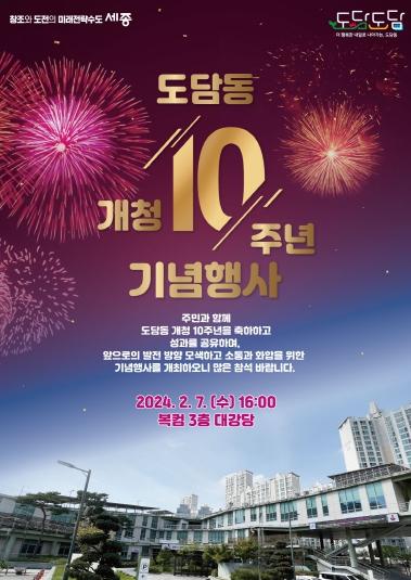도담동은 주민들의 도담동 개청 10주년 축하 메시지와 지난 10년을 돌아보는 기념 영상 등을 상영해 행사를 더욱 풍성하게 진행할 예정이다.