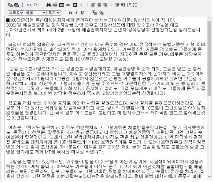 만일 전수조사받으면 가수는 공범으로 처벌받게되고, 예술인증명 취소가 되며, 그동안 받은 돈 혈세인 세금을 모두 토해내야됩니다. 아직도 정신못차리고 그들 대행범죄자에게 돈가져다 바치는 가수여러분, 정신차리셔야 됩니다. 그동안 고발하지 않은것은 선량한 가수들이 공범자가되고, 그러면 모든걸 토해내야하고, 거의 상당수가 그 범죄자들에게 돈을 주었으므로 대문짝만한 뉴스거리가 되는 등 염려로 못한것인데(이 표현은 예술인복지재단쪽 인사들의 표현), 그렇게 가수들에게 저희 MT가 공지하고 알려도. 그걸 우습게보고 아직도 그들에게 돈주고 접수하는사람을 보고 이번 상담후 전수조사 쪽으로 고발가능성있다는점 천명합니다.