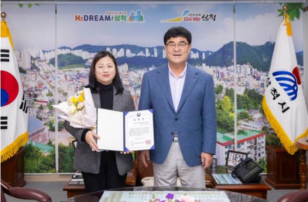 [singers news 씽어즈뉴스, 와보소기자] 삼척여성친화도시 시민참여단 부단장으로 활동 중인 최혜영씨가 여성친화도시 조성 및 확산에 기여한 유공자로 선정되어 여성가족부장관 표창을 수상했다. 전수식은 2월 14일 삼척시장 집무실에서 이루어졌다.