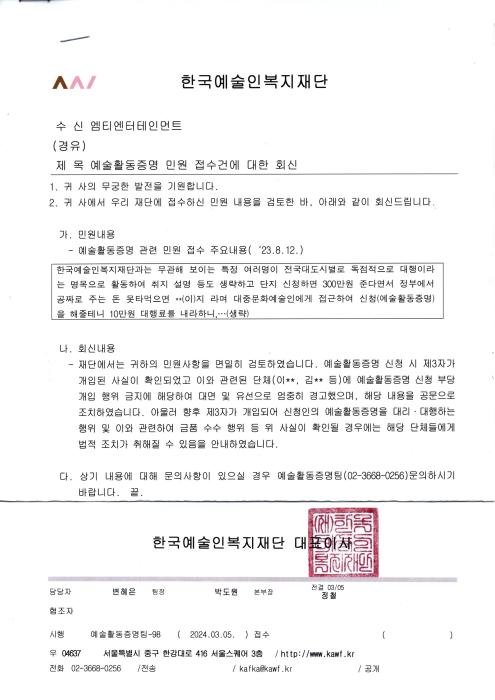 ★속보_5)암튼 이제 그동안엔 너무많은 가수가 개입되어 위 이모씨 김모씨 말구두 전국적으로 주동자급이 여러명이고 거기에 위의 예처럼 각 작곡가 각 예술단장 그리고 중간 바람잡이 가수들까지 합치면 엄청난 인원이 범죄조직처럼되어있고 또 그러다보니 소문으로나돌기는 거의 가수의 80~90프로는 그들통해서 예술증명받거나 창작지원금 타먹엇다고 하니, 그래서 그걸 고발고소해서 경찰조사들어가면 가수들 처벌받는것이 불쌍해서 이를 구조하기 위해서, 일단 그들에게 다시한번 더하면 에누리 없이 고발하겠노라고 경고공문을 최근에 보냈다는 겁니다. 그런 내용을 그런걸 문제 삼은 저희 MT에 공문으로 보내왔다는 사실을 알려드립니다. 위 공문에 그러한 내용이 모두 있는것은 아니고, 2023년8월부터 2024년3월8일 이시간까지 MT에서 복지재단 2번 방문 회의 및 수차례 통화내용 등 그동안 주고받은 내용을 요약하면 위와 같다는것이고 이번공문엔 드디어 복지재단이 칼을 빼들었는데 그게 첫작품으로 2024년1월에 그들을 직접 복지재단에 불러서 구두경고했고 그당시 다시는 안하겠다고 하는 사람들이 계속 범죄행위를 한다고 신고가 들어오자 이번에 드디어 근거마련을 위하여 그들에게 이제 공문나간후 다시 한번만 더 신고가 들어오면 가차없이 법대로 고발조치하겠노라고 경고공문을 보냈다고 그걸 저희 MT로 보내온겁니다. 그래서 공문내용일부를 스캔떠서 공개합니다