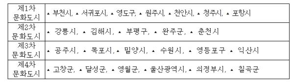 문체부는 2019년부터 2022년까지 제1차 문화도시 7곳, 제2차 문화도시 5곳, 제3차 문화도시 6곳, 제4차 문화도시 6곳 등 총 24곳*의 문화도시를 지정했고, ’23년 12월에는 ‘대한민국 문화도시’ 13곳의 조성계획을 승인했다. ‘대한민국 문화도시’는 1년간의 상담과 예비사업을 거쳐 최종 지정될 예정이다.