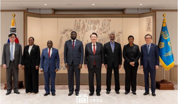 [singers news 씽어즈뉴스, 와보소기자] 윤석열 대통령은 3월 19일 오후 대통령실에서 제3차 민주주의 정상회의 1일 차 장관급회의 참석차 방한한 아프리카 5개국 장·차관급 인사들을 접견했다.
