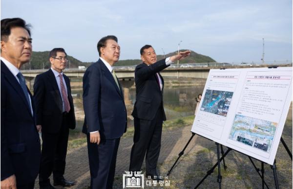 옥룡동 침수 피해 현장에 도착한 대통령은 최원철 공주시장으로부터 수해 복구 상황을 보고받았다. 최 시장은 작년 7월 중순에 내린 집중호우로 금강 수위가 상승해 저지대인 옥룡동 일대에 침수 피해가 발생했으나, 재발 방지와 안전한 환경 조성을 위해 현재 빗물펌프장 설치, 우수관로 개량 등을 추진 중에 있다고 보고했다. 특히, 멀리 보이는 모래톱을 가리키며 대청댐 방류 시 하천 수위가 상승하므로 안전 확보를 위해 준설도 필요할 것으로 보인다고 했다. 이에 대통령은 우리나라 지방 하천에 준설할 곳이 많다며 준설토 활용 필요성에 대해 강조했다.