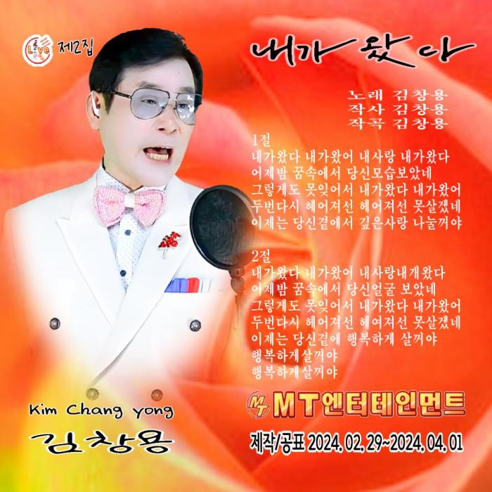 가수 김창용 제2집 내가왔다 음반발매 수록곡 내가왔다 끈(미련곰탱이) 정녕 흰구름가는길 모란동백 동강 누이 계절타령 웬수 모정의세월 마지막의사랑 갓바위 덕수궁돌담길 등