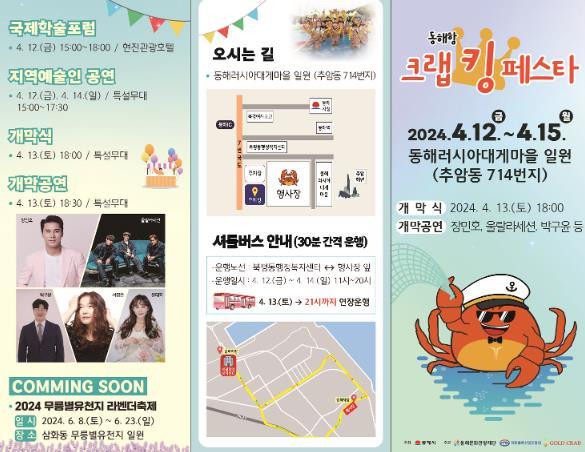 심규언 시장은 “올해 크랩킹 페스타는 남녀노소 모두 즐길 수 있는 다양한 체험 프로그램은 물론 대게 사전 예매, 타임별 현장구매권 배부 등을 통해 대기시간을 줄였고, 셔틀버스도 30분 간격으로 운행하는 등 방문객의 편의성과 축제 만족도를 동시에 높였다.”며, “화창한 봄날 동해시에서 신선하고 저렴한 러시아산 크랩을 먹으며, 특별한 감동과 여유로움을 만끽하기를 바란다.”고 전했다.
