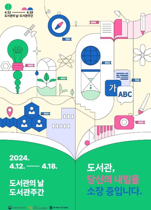 먼저 4월 11일과 12일에는 국립중앙도서관에서 ‘2024 도서관의 날·도서관주간’ 주제 공모전 당선작인 ‘도서관, 당신의 내일을 소장 중입니다’를 주제로 기념행사를 개최한다.