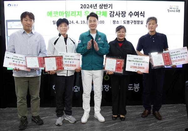 [singers news 씽어즈뉴스, 와보소기자] 도봉구가 4월 19일 2024년 상반기 서울시 에코마일리지 우수단체로 선정된 도봉구 지역 업체 4개소에 감사장을 수여했다.