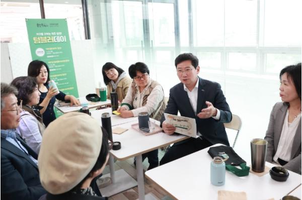 이상일 용인특례시장은 이날 텀블러데이를 맞아 텀블러를 들고 미니몰에서 커피를 구입하고 기후변화체험교육센터 직원, 해설사, 강사 등 직원과 담소를 나눴다.