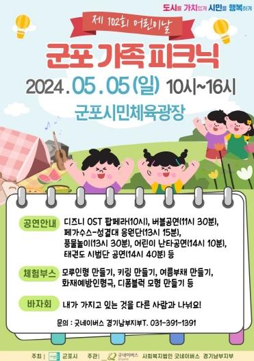 [singers news 씽어즈뉴스, 와보소기자] 군포시는 오는 5월 5일 어린이날에 2024 어린이날 행사 ‘군포 가족 피크닉’ 을 군포시민체육광장에서 개최한다.