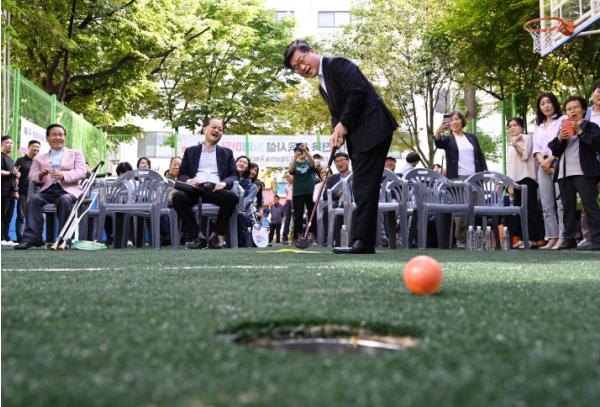 ‘함께마당’이라고 이름 붙인 이곳은 중구 구민회관 옆 쉼터(145㎡)였던 곳에 마련됐다. 바닥에 인조잔디를 깔았고 보치아와 파크골프, 농구, 풋살을 할 수 있는 시설도 구비했다. 앞으로 이곳에선 장애인 생활체육 프로그램이 상시 운영될 예정이다.
