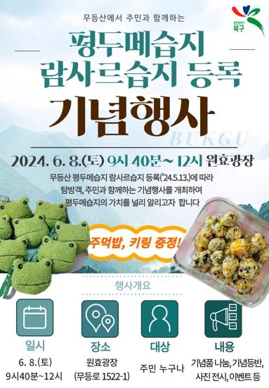 문인 북구청장은 “국제적으로 다양한 생물종의 핵심 서식지로 인정받은 평두메습지를 알리고자 준비한 이번 행사에 주민들의 많은 관심과 성원 바란다”며 “앞으로 관계기관·단체와 적극 협업해 습지를 현명하게 이용하고 보존하여 평두메습지가 지역 활성화의 마중물이 될 수 있도록 최선을 다하겠다”고 말했다.