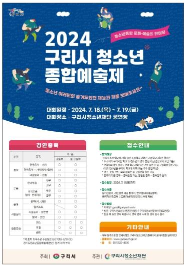 이번 예술제는 ‘청소년 종합 문화?예술의 한마당’이라는 표어를 바탕으로 오는 7월 18일~19일 양일간 구리시청소년재단에서 진행된다. 음악, 무용, 문예, 사물놀이, 대중문화 등 5개 분야, 14개 종목 등 다양한 장르에서 재능을 뽐낼 수 있는 경연의 장으로 꾸며질 예정이다.