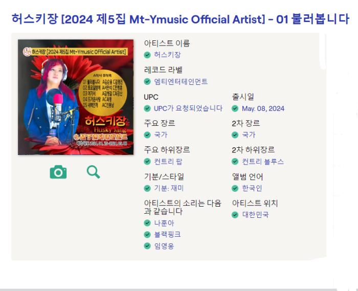 앨범명 - 허스키장의 2024 제5집 Mt-Ymusic Official Artist 음반에 2024.7.3 정오에 발매됨