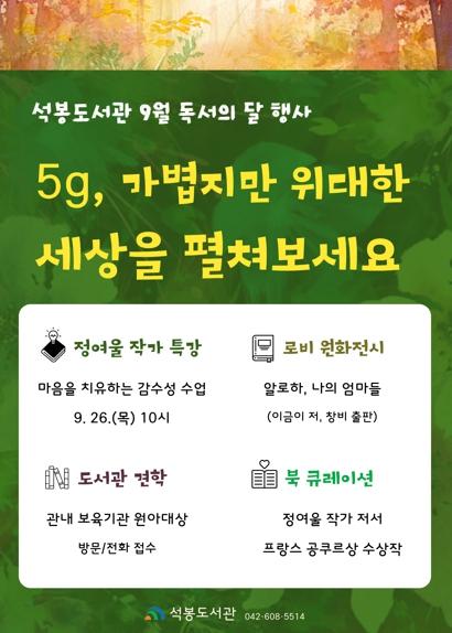 [singers news 씽어즈뉴스, 와보소기자] 대전 대덕구 석봉도서관은 9월 독서의 달을 맞아 작가특강, 도서 전시, 북 큐레이션, 도서관 견학 등 다채로운 독서 행사를 운영한다고 밝혔다.