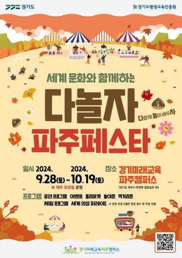 [singers news 씽어즈뉴스, 와보소기자] 경기도가 주최하고 도 평생교육진흥원이 주관하는 ‘다놀자 파주페스타’가 9월 28일부터 10월 19일까지 매주 토요일 경기미래교육파주캠퍼스에서 열린다.